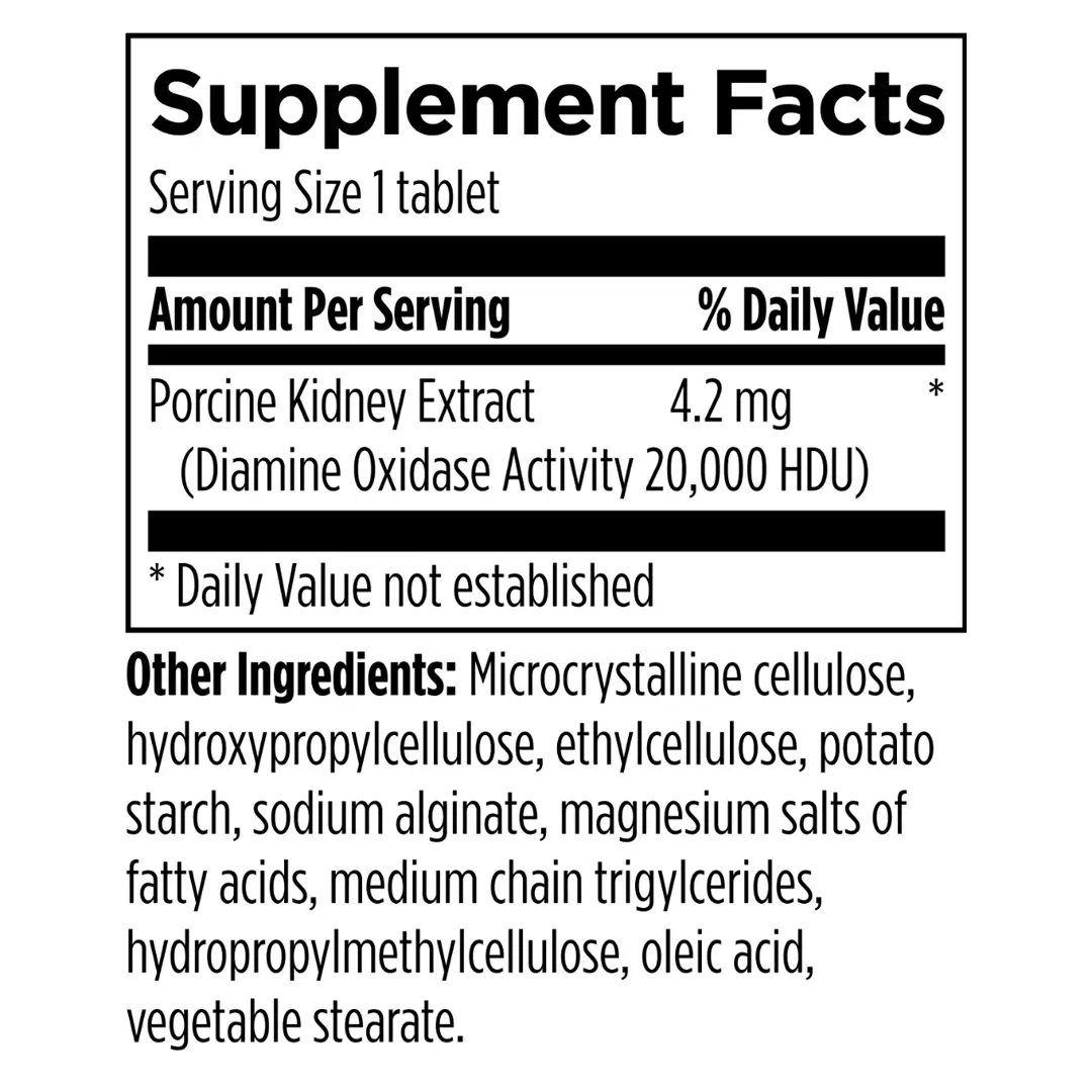Each tablet provides 20,000 histamine-degrading units (HDU) of diamine oxidase (DAO) from porcine kidney extract to promote the degradation of dietary histamines.* HistaGest-DAO™ is formulated with gastro-resistant, coated tablets with delayed-release technology that allows the DAO enzyme to reach the small intestine where it performs its action. Taking one tablet before each meal promotes the amount of DAO in the small bowel to help break down histamine in the digestive tract and soothe digestive discomfort associated with sensitivity to histamine-rich foods.*