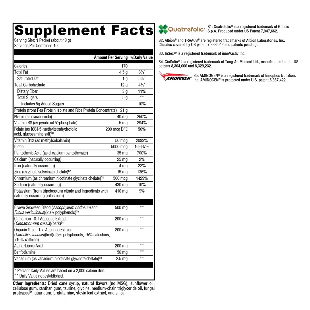 OptiMetaboliX 2:1 also delivers other innovative ingredients, including VegaPro™—a proprietary sugar-free, sweetener-free, low-allergy-potential source of vegetable protein from pea protein and rice protein—and CinSulin®, a patented water extract of cinnamon with a potent 10:1 yield ratio. Cinnamon has been studied extensively for its roles in supporting healthy glucose uptake, glycogen synthesis, and insulin action, along with maintaining blood lipids already within the normal range. These principal ingredients are complemented by the inclusion of benfotiamine to boost transketolase activity; alpha-lipoic acid; green tea leaf extract; vanadium, chromium, and zinc as Albion® TRAACS® chelates; 5-MTHF (bioactive folate) as Quatrefolic®; and other key vitamins and minerals.*