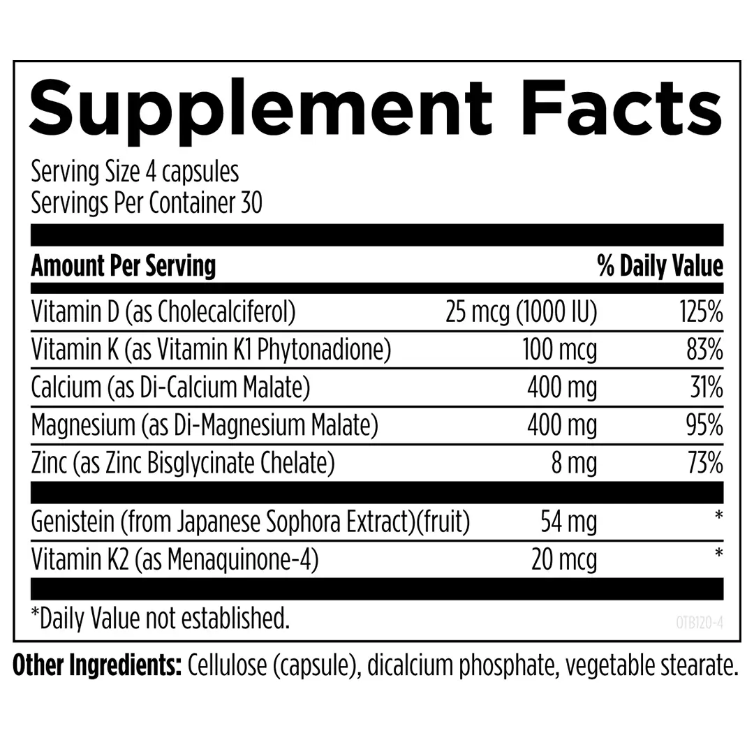 Osteoben® is a vitamin and mineral blend formulated to support bone strength and health.* It provides nutrients and other compounds necessary for the physical structure and proper maintenance of bone tissue, including the minerals calcium, magnesium, and zinc, along with vitamins D and K2.* Osteoben® also features the phytoestrogen genistein from the Japanese sophora extract, a non-soy plant source.