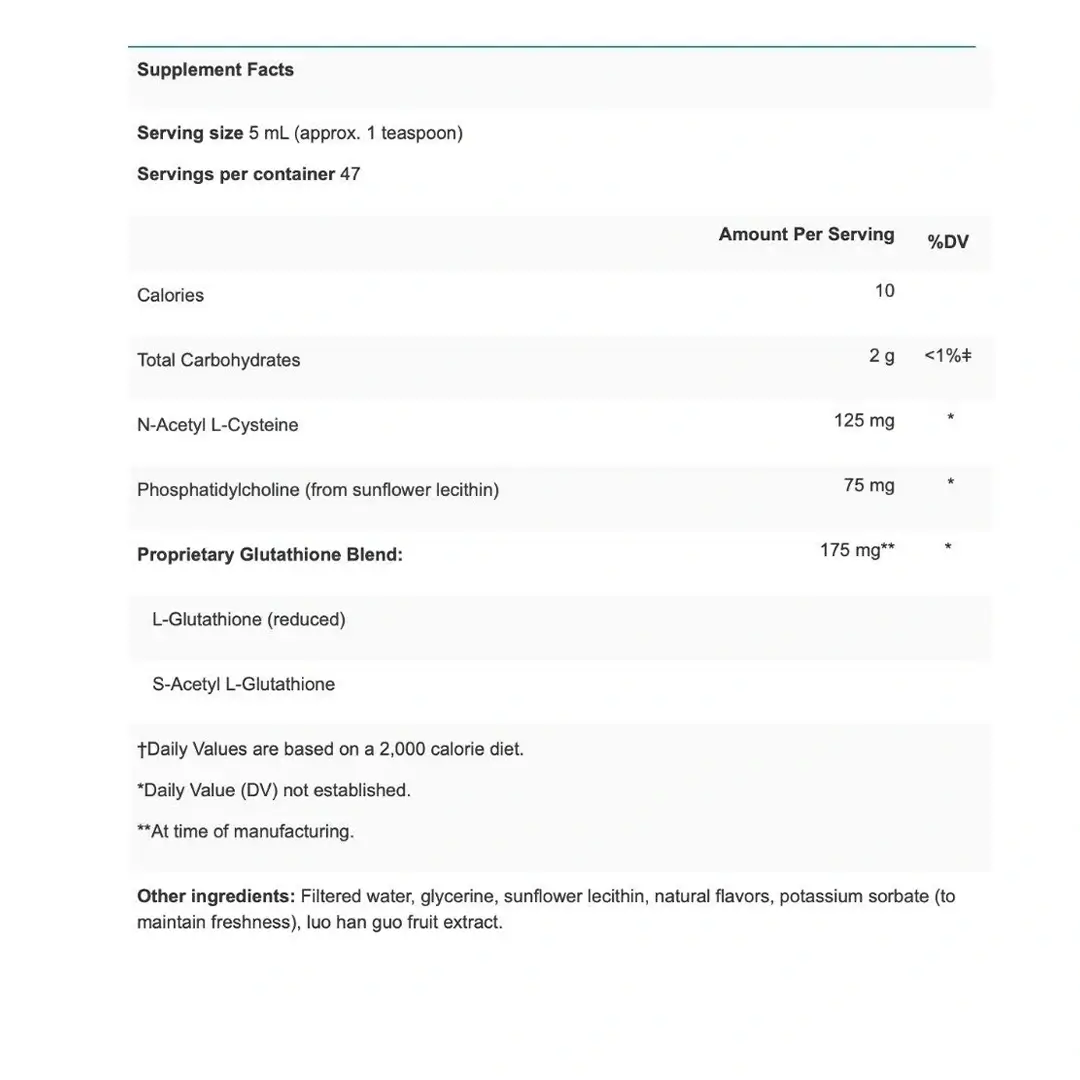 Liposomal solution, S-acetyl L-glutathione (SAG), combined with reduced glutathione (GSH), and N-acetyl L-cysteine (NAC). This formulation utilizes three ways to support glutathione—intracellular with SAG, intracellular biosynthesis with NAC, and extra/intracellular (systemic) support with GSH. The liposomal S-acetyl L-glutathione in this formula provides a double layer (acetylation + liposomes) of protection to the glutathione molecule, further supporting its intracellular bioavailability.